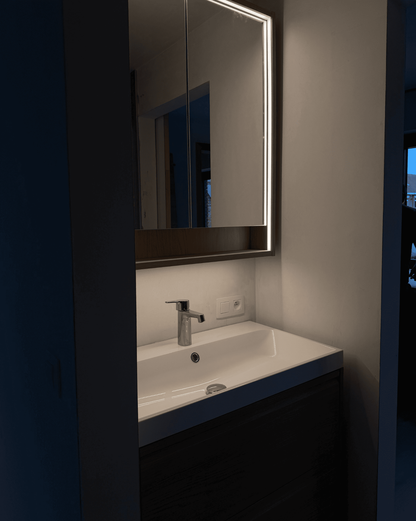 “Wat ik positief vond, was dat er onmiddellijk werd meegedacht. Niet alleen over de plannen, maar ook over keuzes. Ik herinner me dat Lorenzo zelfs zei: ‘Je moet nekeer boven komen kijken naar onze badkamer, zie hoe wij het gedaan hebben.’ Omdat we aan het twijfelen waren van volledig te tegelen.” – Wouter