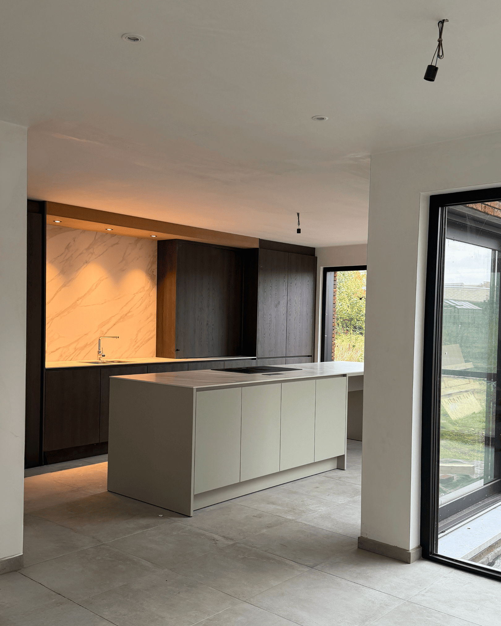 In hun vorige woning hadden ze nog maar pas een nieuwe keuken geplaatst, maar die wilden ze niet opnieuw kopiëren. En eerlijk? Deze nieuwe ruime leefkeuken, is om over te dromen.