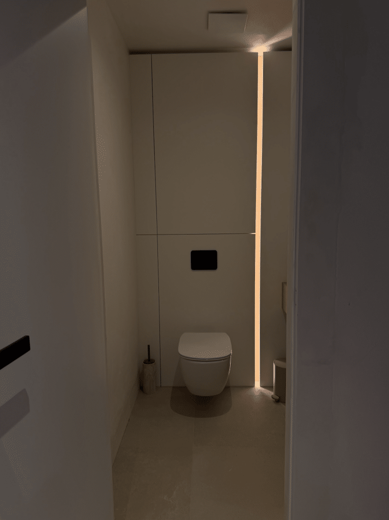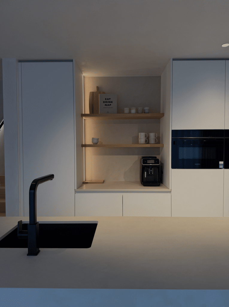 ze kozen voor een tijdloos interieur dat warmte uitstraalt, met aandacht voor verlichting en een doordachte indeling. Slimme details maken het verschil: een verborgen deur die leidt naar de voorraadkamer, de zij-ingang en een garage die volledig opgaat in het exterieur.