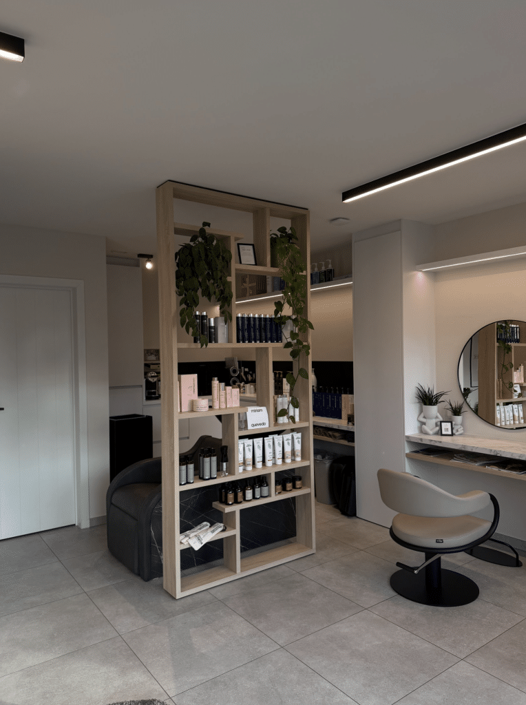 Het koppel is dan ook zeer tevreden over de aannemers, maar wil één persoon extra in de spotlight zetten: Joeri Maeyens, verantwoordelijk voor het totaalinterieur en maatwerk. Dankzij hem kreeg het kapsalon van Mieke precies de uitstraling en functionaliteit die ze nodig had.